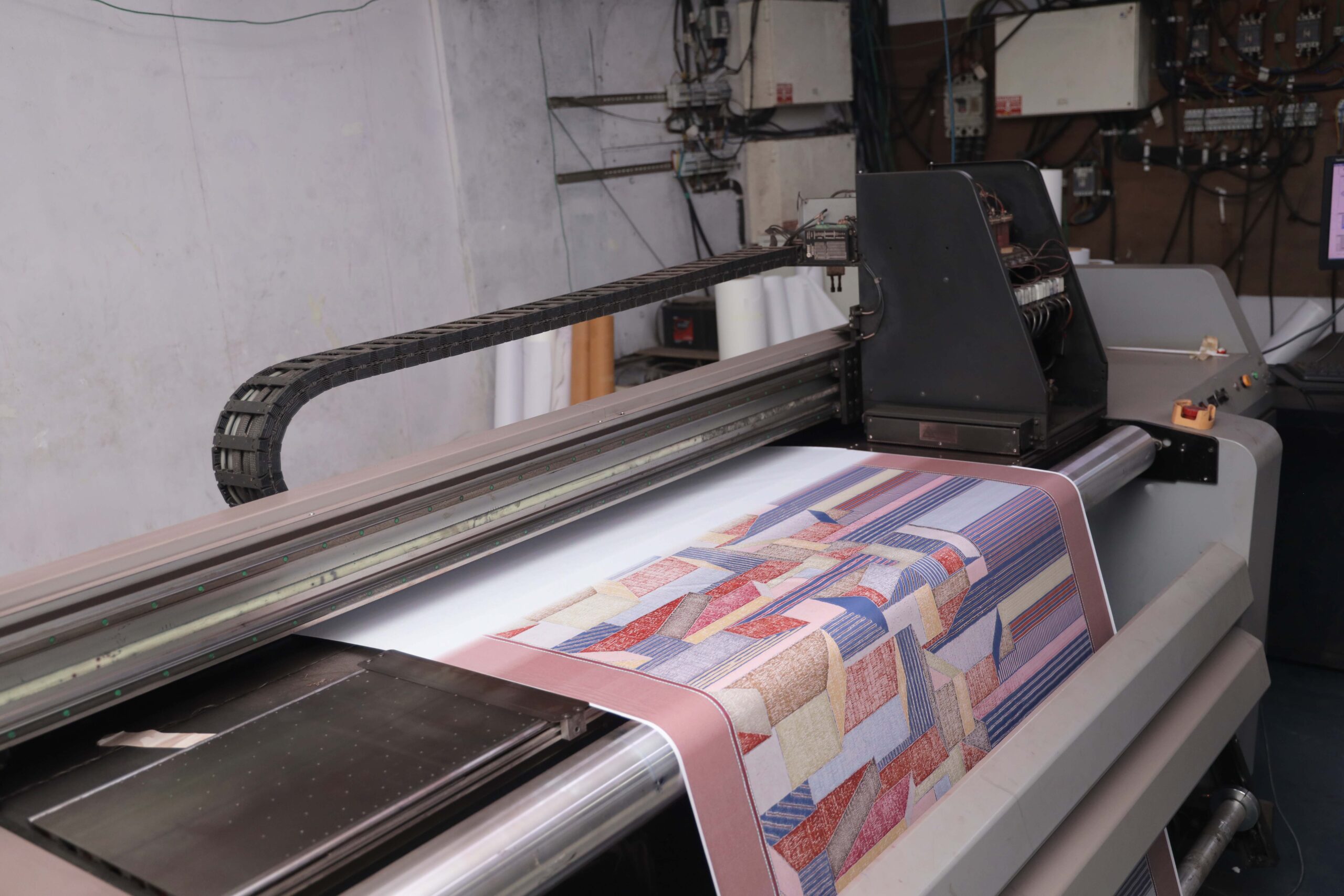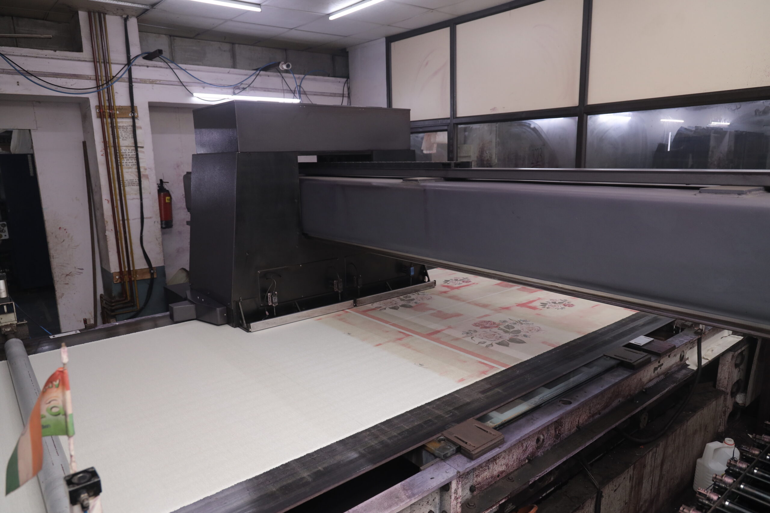 Industrial digital printer with a transportation belt for both fabric and paper Advantages:- Great flexibility for various fabrics, high capacity color tanks, head crash protection